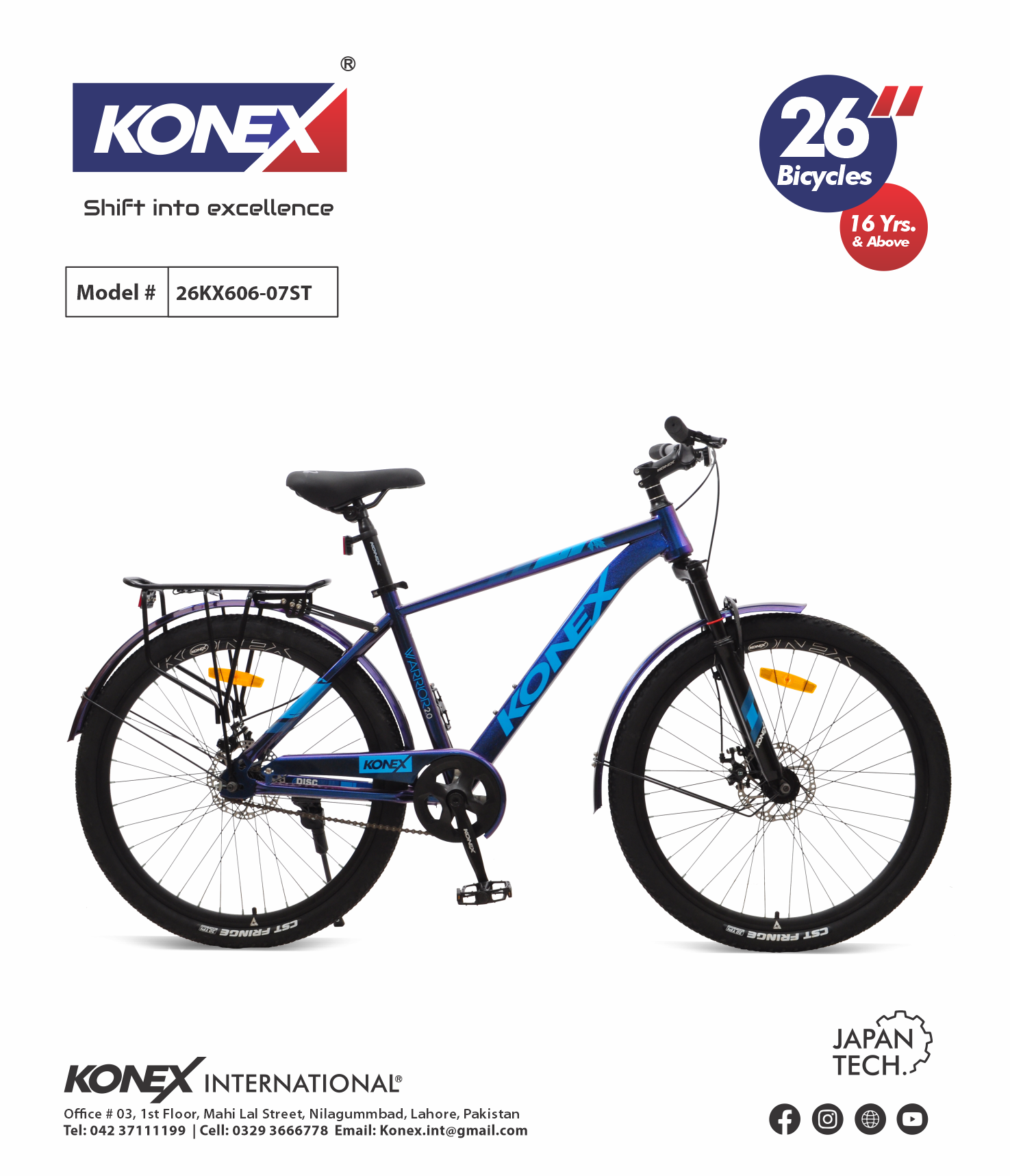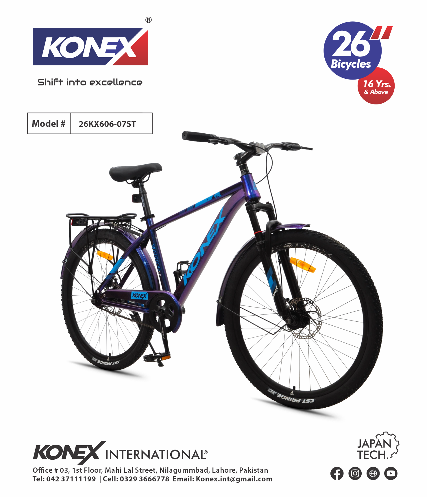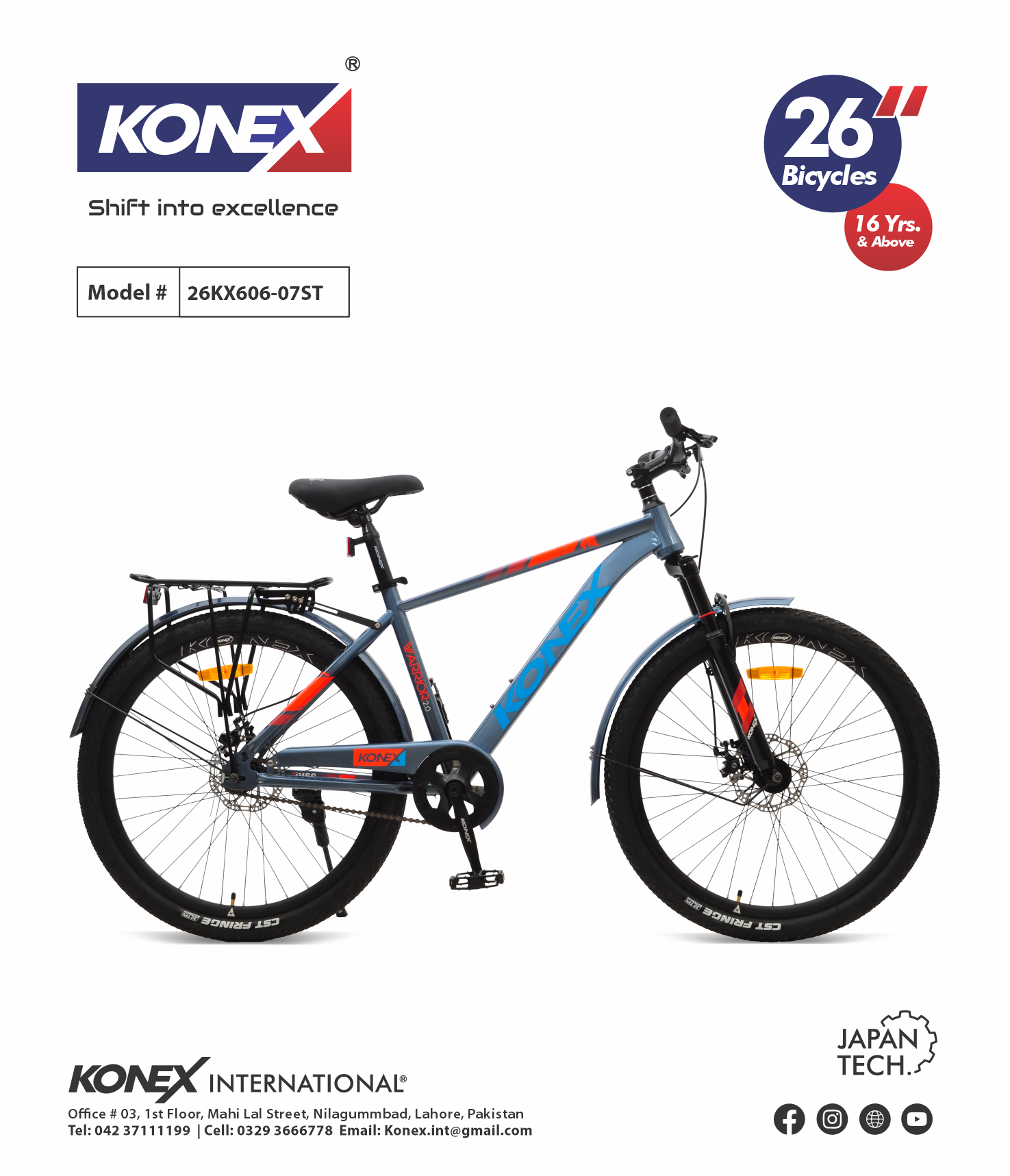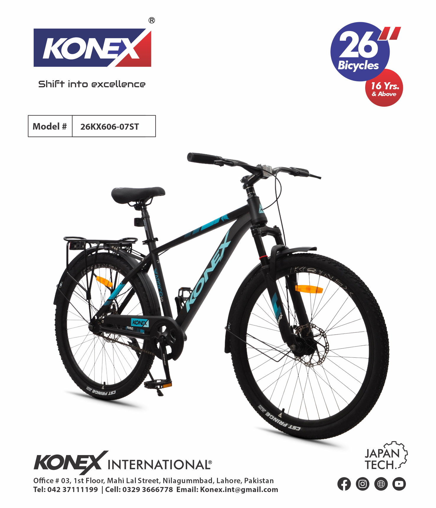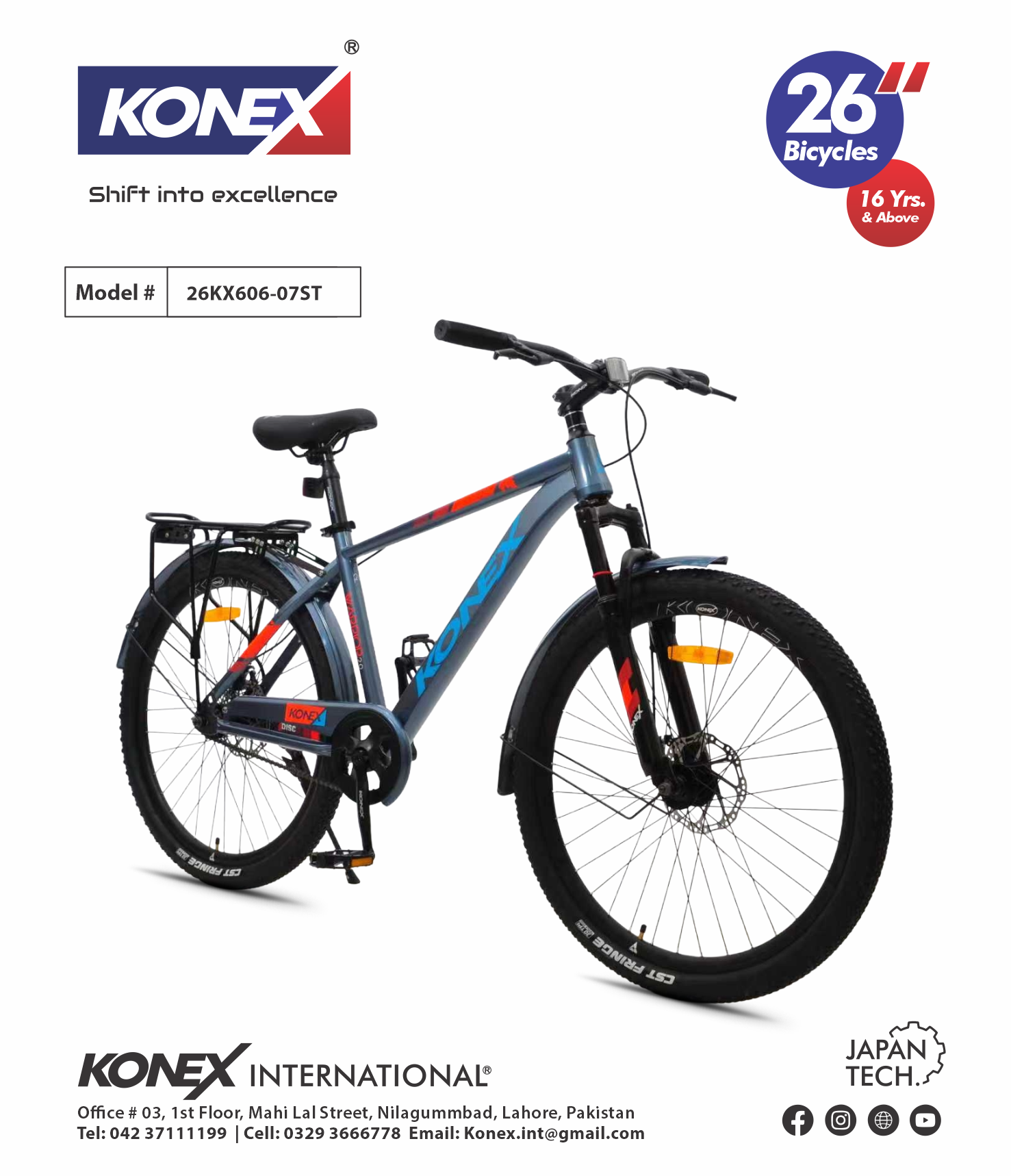 The KONEX 26KX606-07ST is a full-sized 26-inch bicycle engineered for riders 16 years and above. Combining the ruggedness of a mountain bike with the simplicity of a single-speed drivetrain, this model is built with “Japan Tech” precision to handle daily commutes and weekend adventures with equal ease.